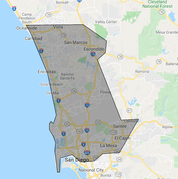 We deliver to 92% of San Diego County. If you live in the shaded area, we deliver to you. If you live outside this area, shoot us a call or text @ (858) 621-3212.
